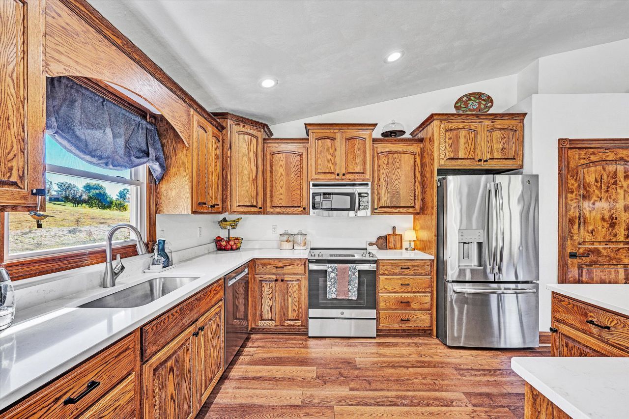 Welcome to our farmette on 6 acres w/ a stream, gorgeous mountain views & fiber internet! This one-owner custom-built home by GFW Construction offers great potential for multi-generational living. Each floor offers a primary suite, as well as laundry on both floors. The entry floor has been updated with LVP flooring, quartz counters in the kitchen & bathrooms. The basement has an open joist ceiling & features a large open family space as well as preparations for a kitchenette. Electrical line for the range has been run, cabinets/countertops have not been affixed but do convey. Several of the basement rooms are flex space and could certainly be used in a different manner than present use. There is a concrete room under the porch. This area could be a safe room. It has been divided in half &